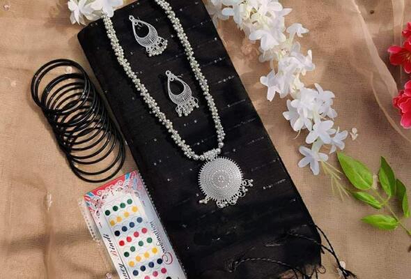 ✅▪️শাড়ি,গলার নেকলেস+কানের দুল,রেশমী চুরি, টিপ কম্ব সেট।🔰